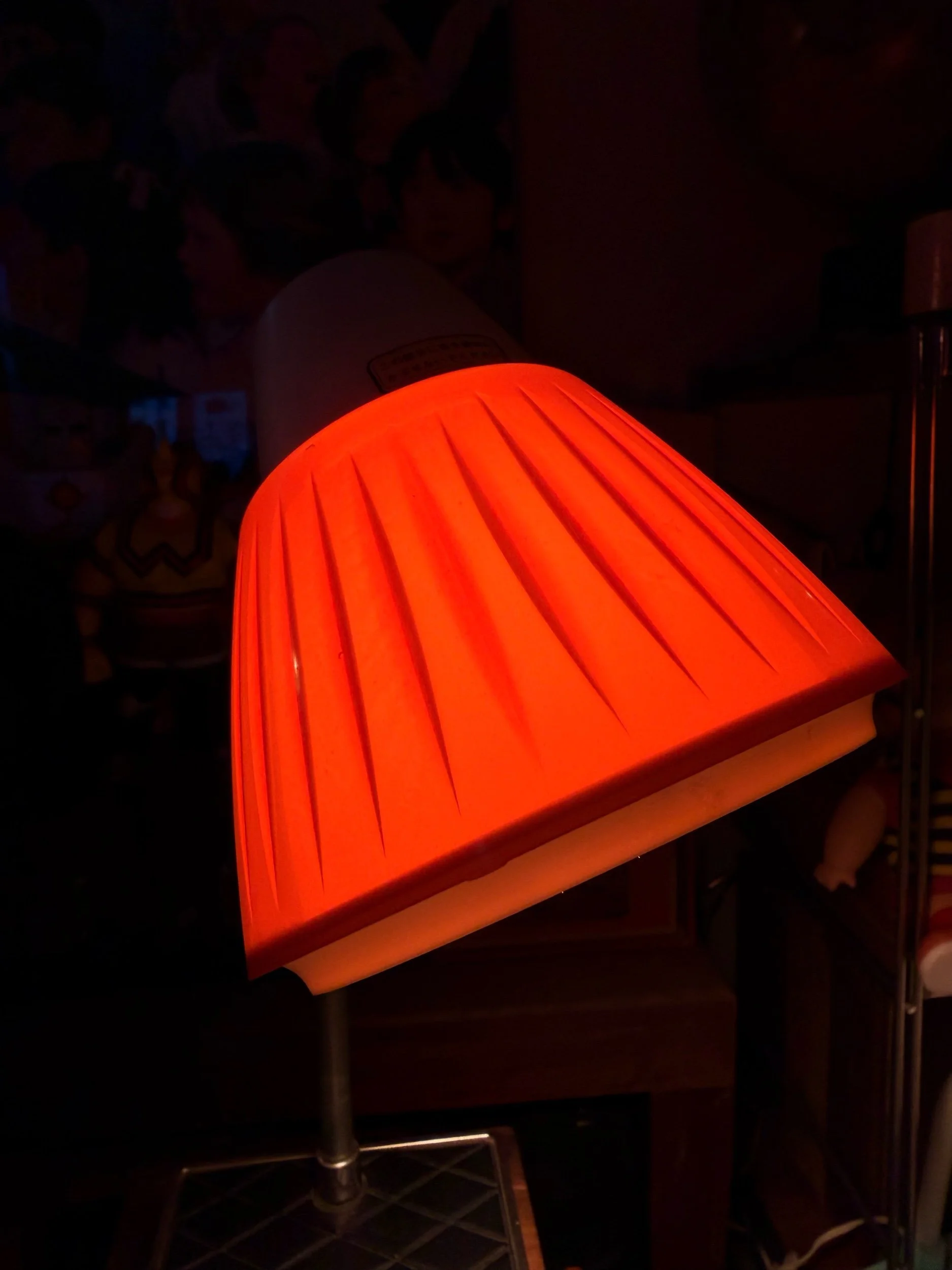 燈罩設計:燈罩呈現鮮艷的橘紅色,造型圓潤且帶有垂直的立體稜紋,這種設計能讓光線在視覺上產生律動感,同時也帶有強烈的Pop Art風格。